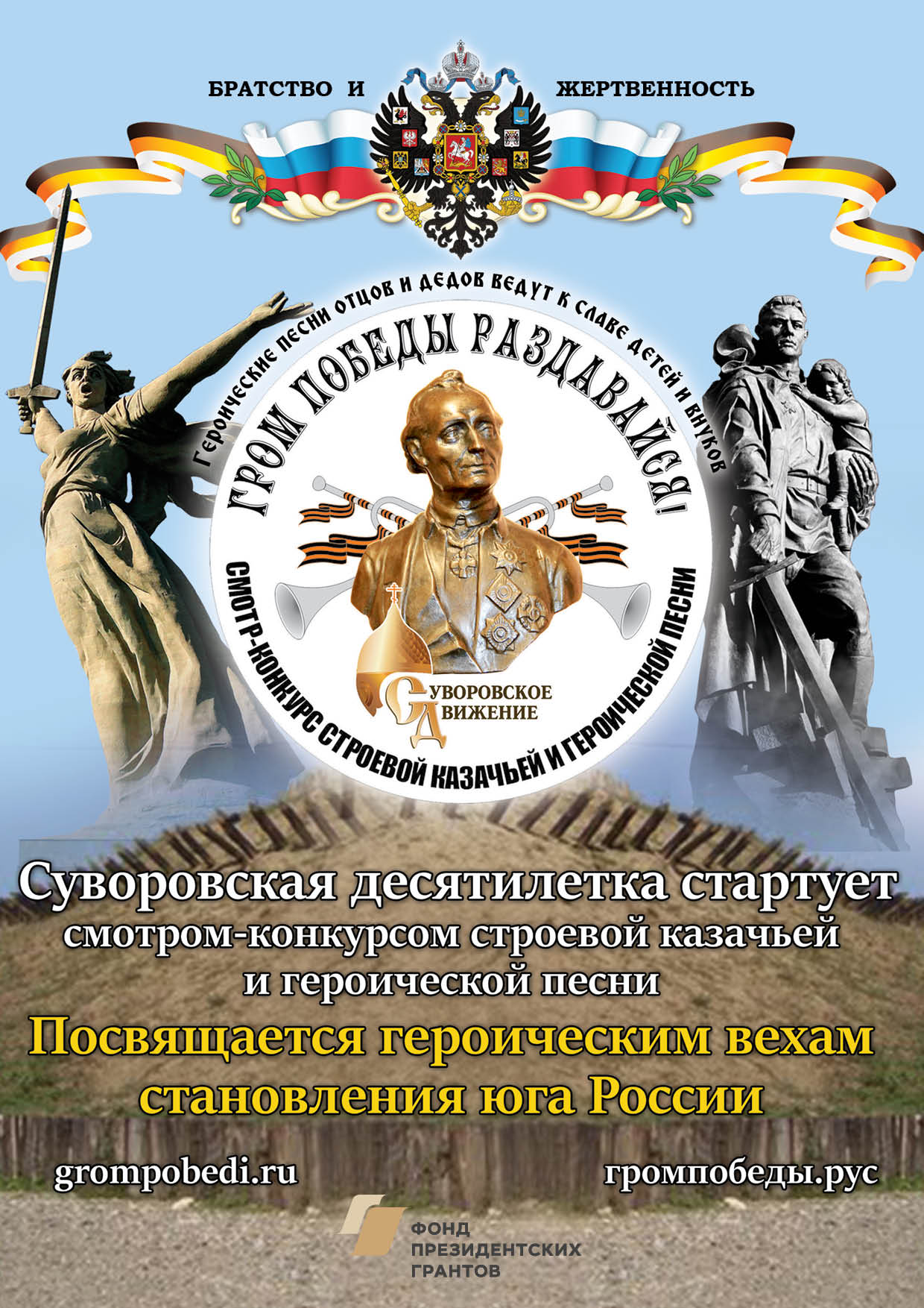 Смотром-конкурсом героической песни был дан старт суворовской десятилетки. У «Суворовского движения» в поддержку прославления А.В.Суворова в лике святых Русской Православной Церкви впереди еще много интересных проектов и реальных дел, участие в которых, станет лучшим примером народного почитания и воплощением победной науки полководца русского духа.
